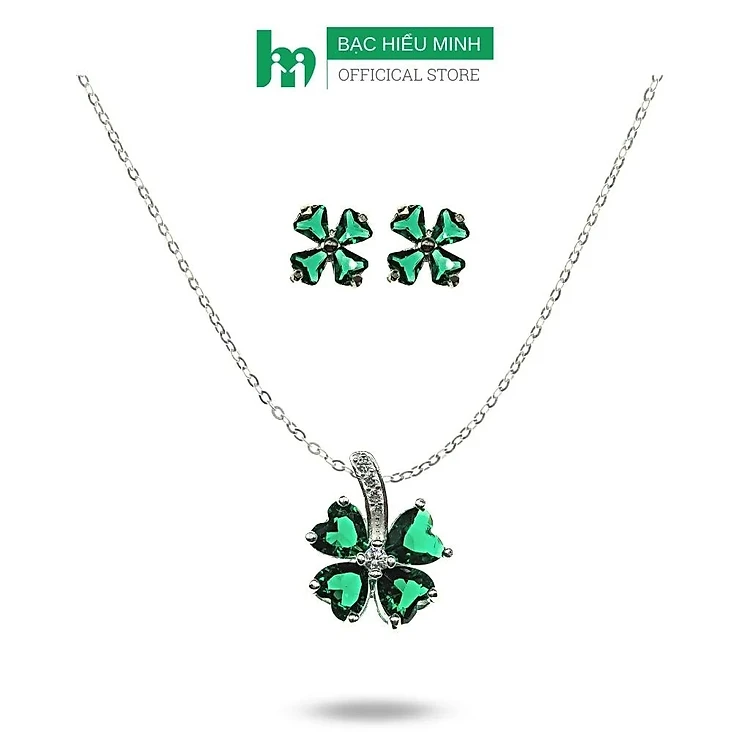 Combo Dây Chuyền Hoa Tai Bạc Ta Cỏ 4 Lá Màu Xanh May Mắn BẠC HIỂU MINH BCB006