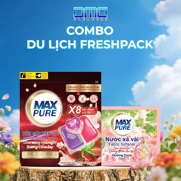 Combo Du Lịch FreshPack Maxpure: Túi Viên Giặt Hương Đắm Say + Dây Nước Xả Hương Coco (10 Gói) | Sạch Thơm, Tiện Lợi