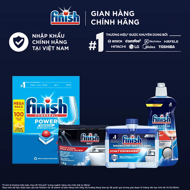 Combo Finish toàn diện 2: Hộp 100 Viên Rửa Bát Essential + Nước Làm Bóng Finish 500ml + Muối Rửa Chén Finish Salt túi 1kg + Dung dịch vệ sinh máy
