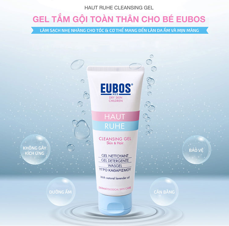 - Gel Tắm Gội Cho Trẻ Em EUBOS Haut Ruhe Cleansing Gel Skin & Hair 125ml với chiết xuất từ gel lô hội, bổ sung dầu hạt hướng dương, dầu dừa, dầu oải hương cùng khóang biển có tác dụng làm sạch nhẹ nhàng cho da và tóc của trẻ.