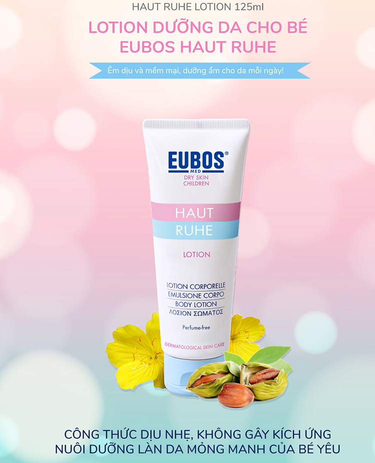 - Dung Dịch Dưỡng Da Trẻ Em EUBOS Haut Ruhe Lotion 125ml với tinh dầu hoa anh thảo 6%, dầu hạnh nhân và dầu jojoba được khuyên dùng để dưỡng ẩm toàn thân hàng ngày cho da khô ở trẻ sơ sinh và trẻ nhỏ.