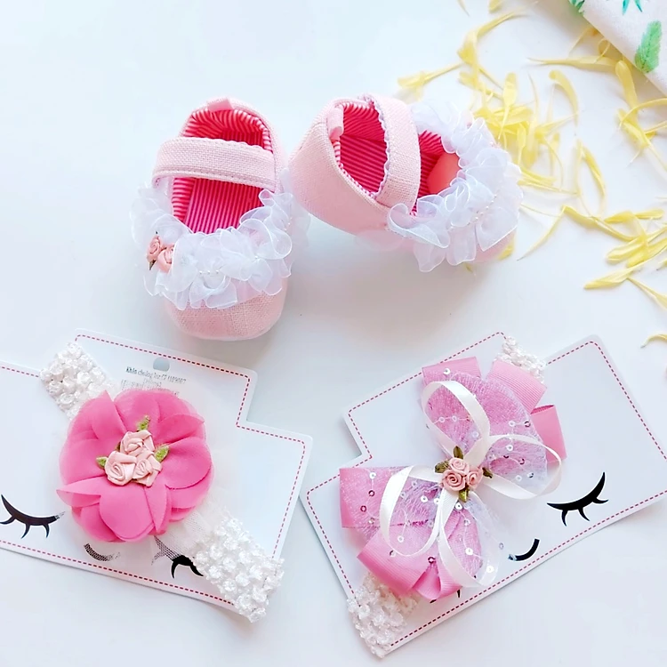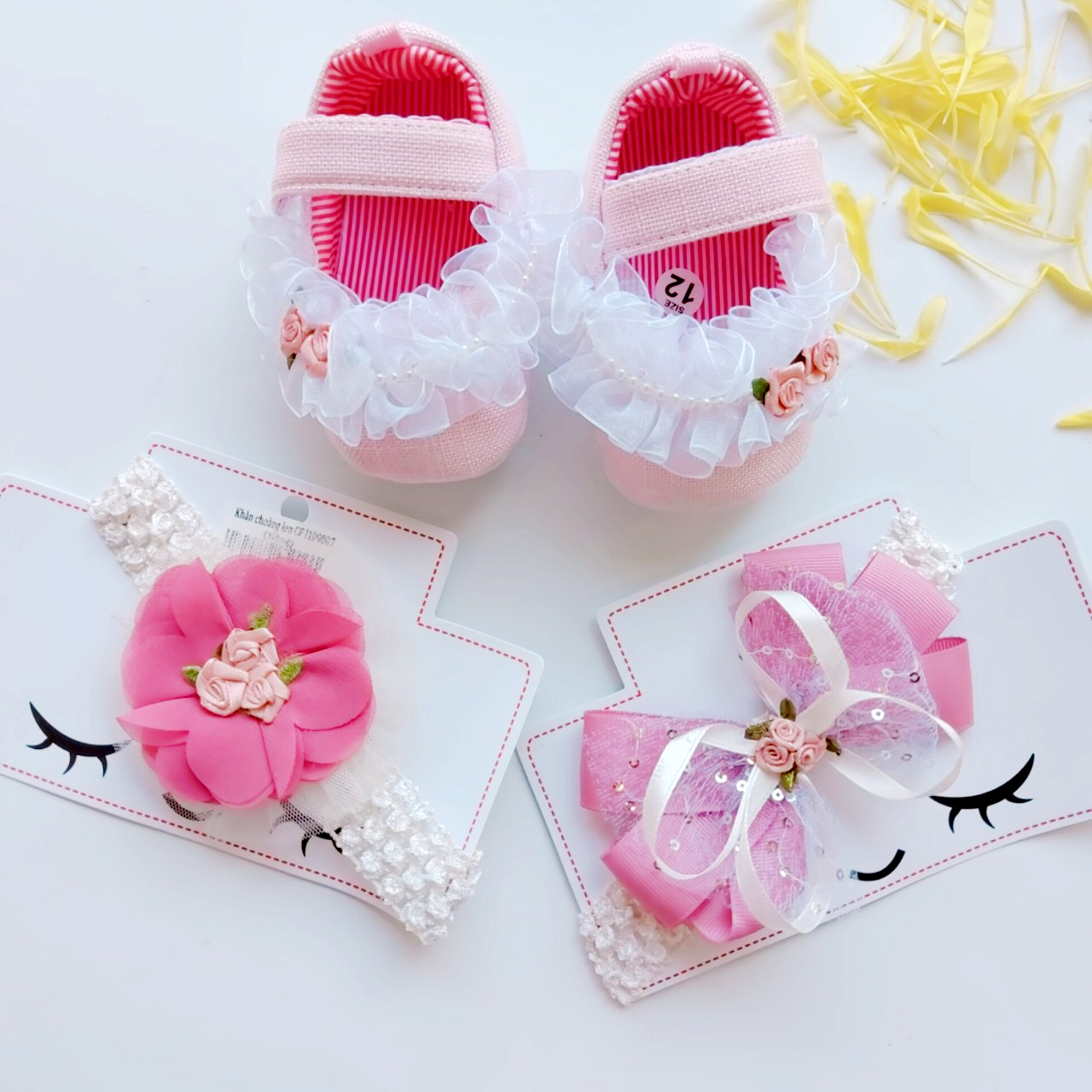 Bộ sản phẩm gồm 1 đôi giày tập đi và 2 băng đô cùng màu giày cho bé tỏa sáng trong những dịp quan trọng như thôi nôi đầy tháng, thôi nôi đầu năm.