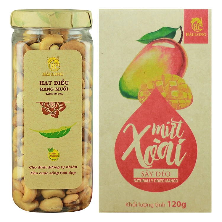 Combo Hạt Điều Rang Muối Tách Vỏ Lụa Hải Long (250g) + Mứt Xoài Sấy Dẻo Hải Long (120g)
