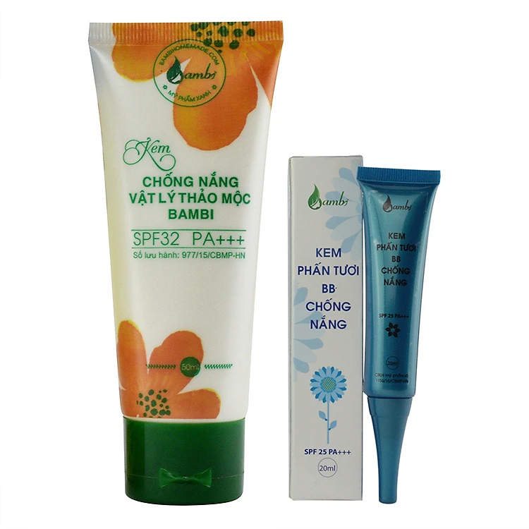 Combo Kem Chống Nắng Thảo Mộc Bambi + Kem Phấn Tươi BB Chống Nắng Bambi giúp bạn chăm sóc làn da một cách toàn diện, chống lại các tác nhân môi trường gây hại, giúp da luôn trắng sáng, mịn màng.