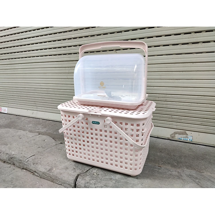 Combo khay kệ úp bình sữa và Giỏ làn đựng đồ đi sinh cho mẹ và bé bằng nhựa cao cấp quai giữa có nắp đậy Hàn Quốc