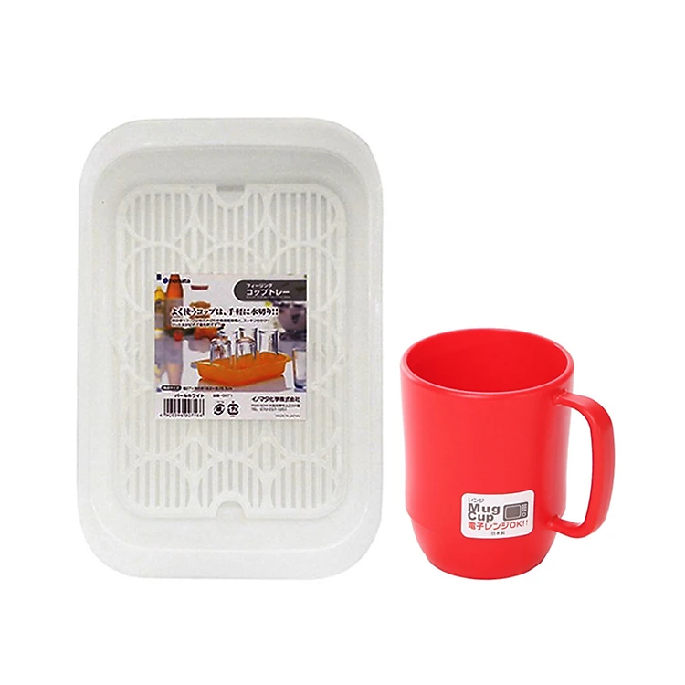 Combo Khay Úp Cốc Chén Có Lỗ Thoát Nước Màu Trắng + Cốc Nhựa Cao Cấp Tiện Dụng Màu Đỏ - Nội Địa Nhật Bản