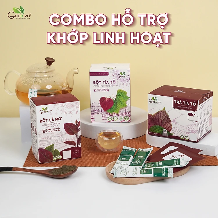 Combo Khớp linh hoạt (1 hộp Trà tía tô túi lọc 40g, 1 hộp Bôt tía tô 72g, 1 hộp Bột lá mơ 60g)