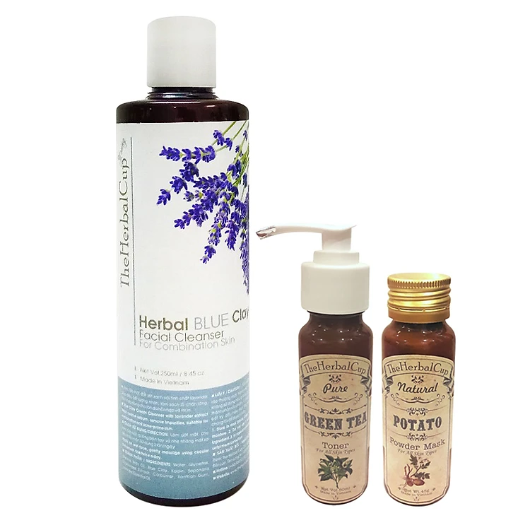 Combo Làm Sạch Theherbalcup: Toner Trà Xanh (100ml) + Mặt Nạ Bột Khoai Tây (50g) + Kem Rửa Mặt Đất Sét (100ml) - Tinh chất trà xanh có trong toner sẽ giúp chống oxi hóa da, kháng khuẩn, hỗ trợ điều trị mụn và hạn chế tăng tiết bã nhờn, cho da mềm mại, mịn màng và sạch mụn. Mặt nạ không chỉ giúp hạn chế sự sản sinh hắc sắc tố, tái tạo cấu trúc da mà còn cho bạn làn da căng mịn và đàn hồi, tươi trẻ cùng thời gian. Kem rửa mặt với thành phần vô cơ đất sét xanh, và khoáng vi lượng, kết hợp với tinh dầu thảo mộc Lavender (là chất bảo quản tự nhiên) rất tốt cho da và an toàn.