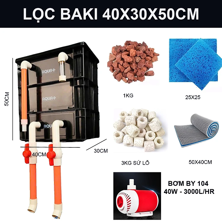 Combo Lọc Thùng Baki Bể Cá 40x30x50cm + Bơm Baoyu 104 & Vật Liệu Lọc Nâng Cao Cho Hồ 400 - 600L