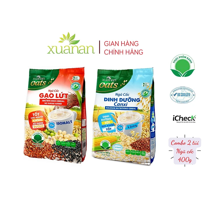 Combo 2 túi: Ngũ Cốc Dinh Dưỡng Canxi ít đường 400G + Ngũ Cốc Gạo Lứt No Sugar[đường ăn kiêng]400G(Tặng Kèm 1 Túi Yến Mạch 150G)