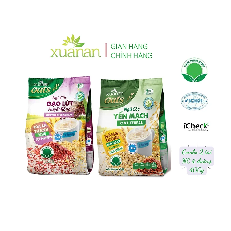 Combo 2 túi: Ngũ Cốc Gạo Lứt Huyết Rồng 400G + Ngũ Cốc Yến Mạch 400G [ít đường] (Tặng Kèm 1 Túi Yến Mạch 150G)