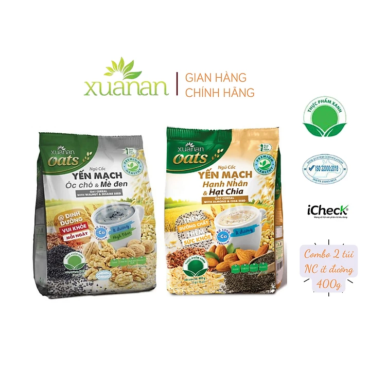 Combo 2 túi: Ngũ Cốc Yến Mạch Hạnh Nhân Hạt Chia 400G + NC Yến Mạch Óc Chó & Mè Đen 400G[ít đường](Tặng Kèm 1 Túi Yến Mạch 150G)