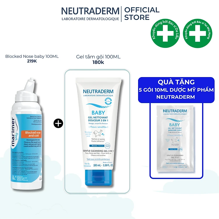 Combo nước biển sâu Marimer Baby Blocked + Gel tắm 3in1 Neutraderm