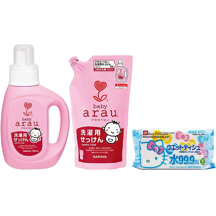 Combo Nước Giặt Arau Baby Bình 800ml + Túi 720ml - Tặng Gói Giấy Ướt LEC 99,9% Nước Tinh Khiết Hello Kitty SS-237 80 Tờ