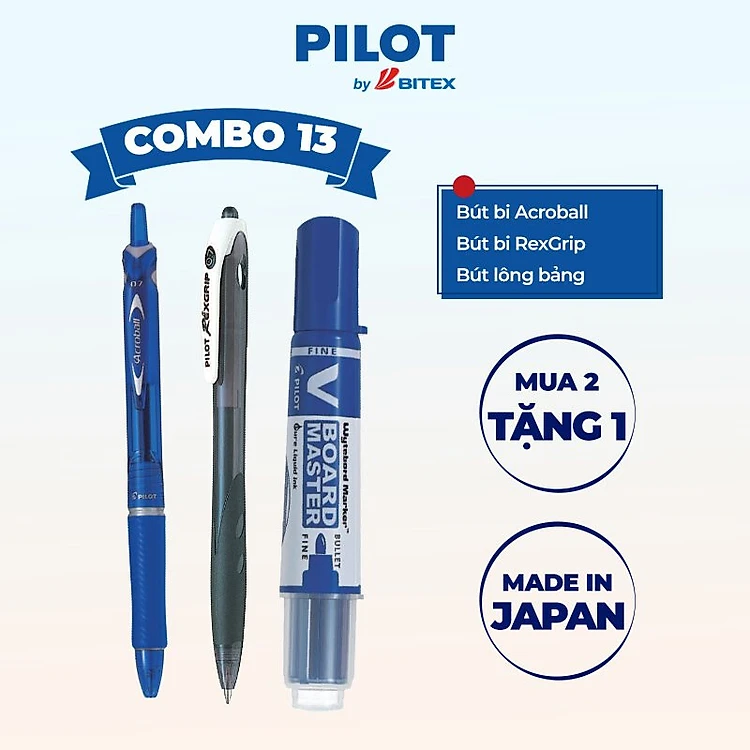 Combo Pilot 13 : Bút bi Acroball mực xanh, Bút bi Rexgrip mực đen,Bút lông bảng V Board Master mực xanh (Tip nhỏ)