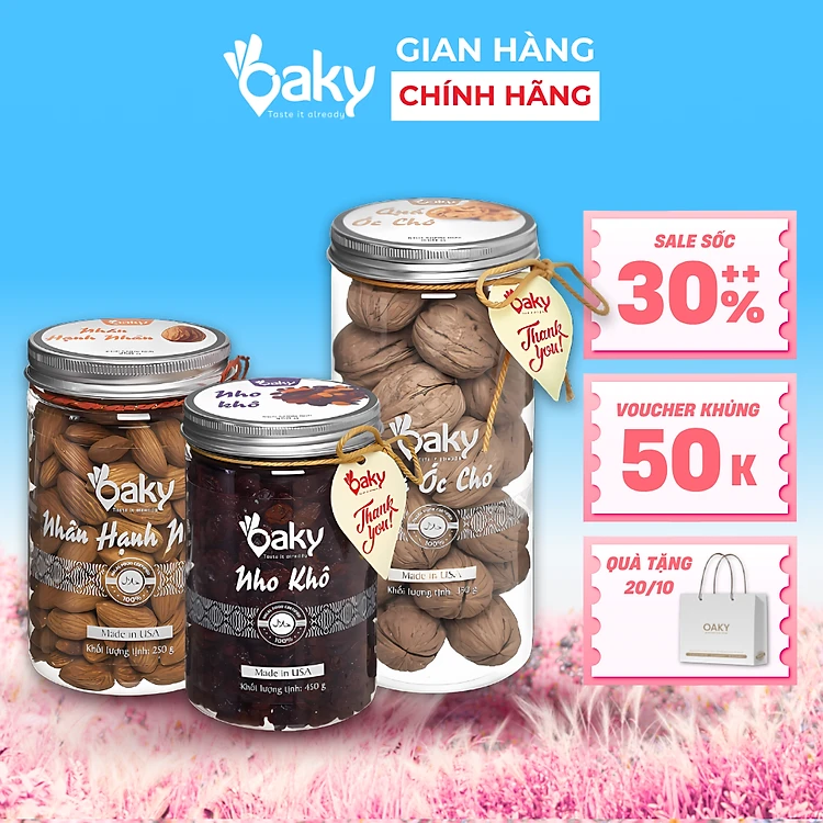 Combo Quà Tặng - Hạt Dinh Dưỡng Cao Cấp Oaky Hạnh Nhân Mỹ, Óc Chó Vàng, Nho Khô - Tặng kèm Túi Giấy Sang Trọng
