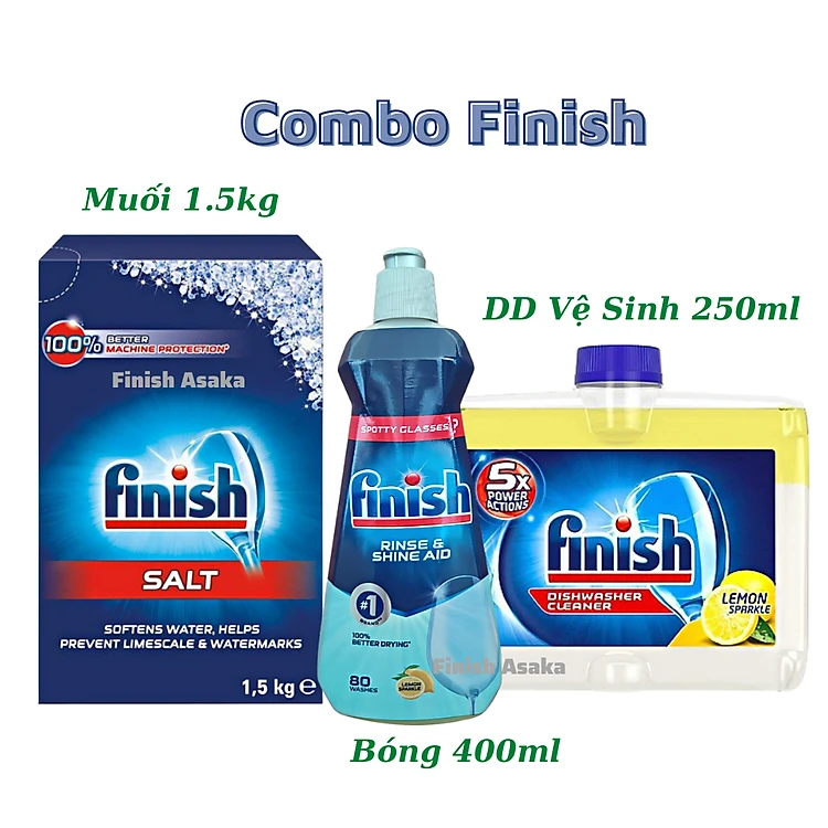 Combo rửa bát Finish: Dung dịch vệ sinh máy rửa bát chai 250ml, Bóng 400ml, Muối hộp 1,5kg - Nhập khẩu Châu Âu.