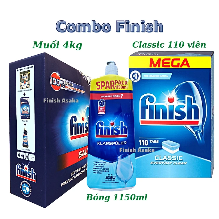 Combo rửa chén Finish: Nước Làm bóng 1150ml, Muối hộp 4kg, Hộp Classic 110 viên - Nhập khẩu Châu Âu.