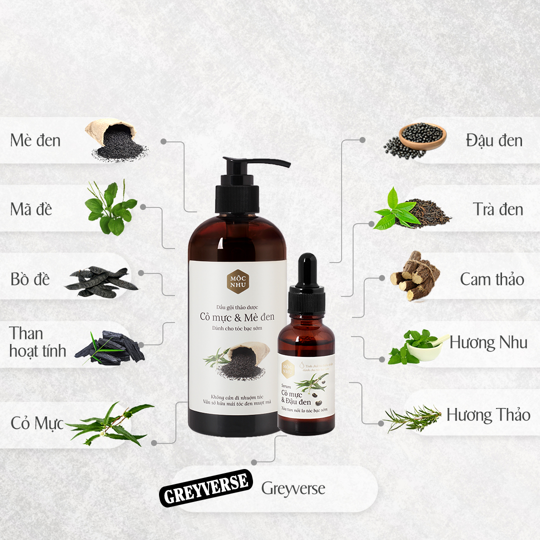 Bộ đôi Serum & Dầu gội Cỏ Mực Mộc Nhu giúp chặn đứng sự phát triển của tóc bạc, giúpcơ thể sản sinh melanin tự nhiên cho chân tóc, mang đến cho bạn một mái tóc đen tự nhiên.