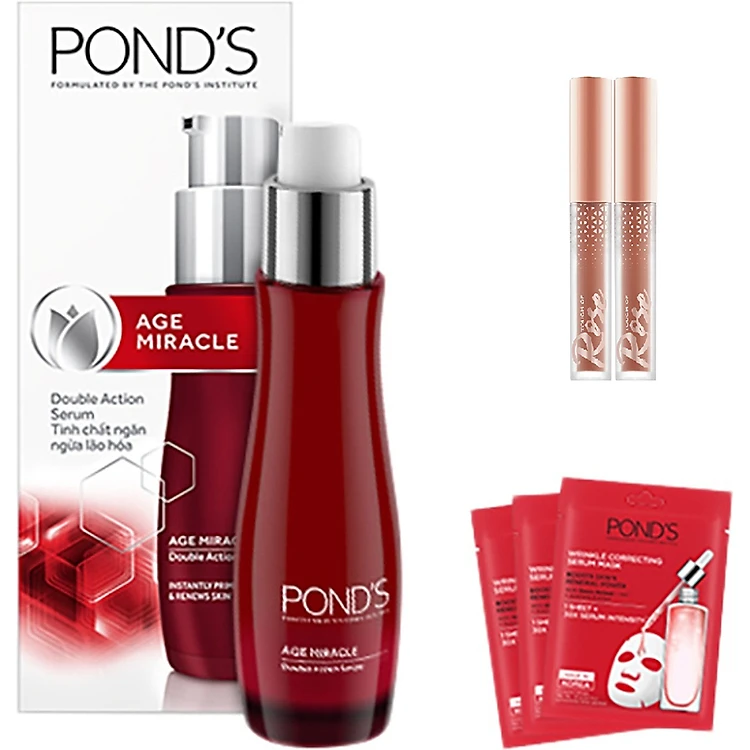 - Combo Serum Ngăn Ngừa Lão Hóa Pond's Age Miracle Double Action (30ml) + 3 Mặt Nạ Pond's Ngăn Ngừa Lão Hóa (21ml/Miếng) Bước dưỡng chuyên sâu giúp giải quyết các dấu hiệu lão hóa từ sớm (nếp nhăn, thâm nám, da mất đàn hồi)
