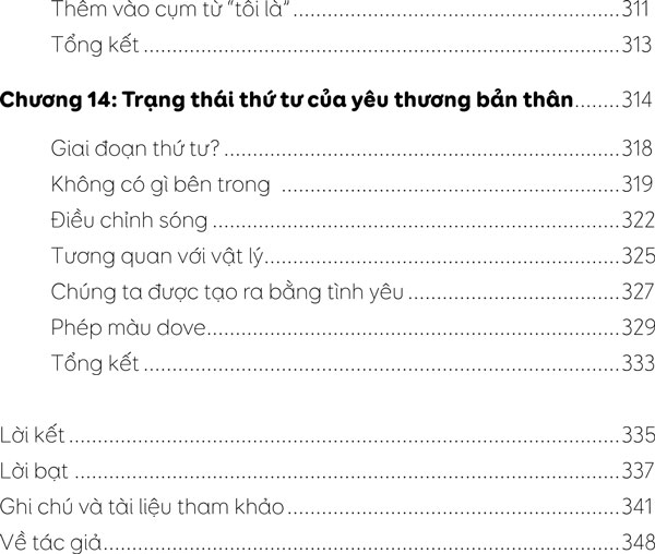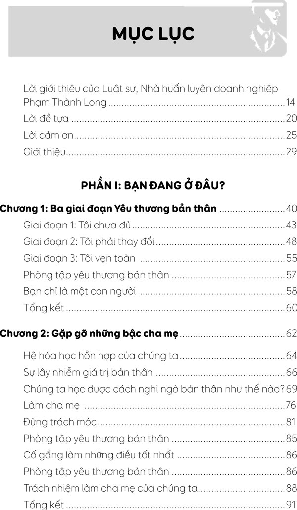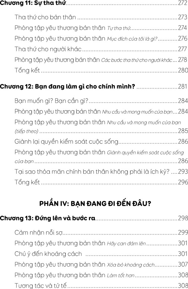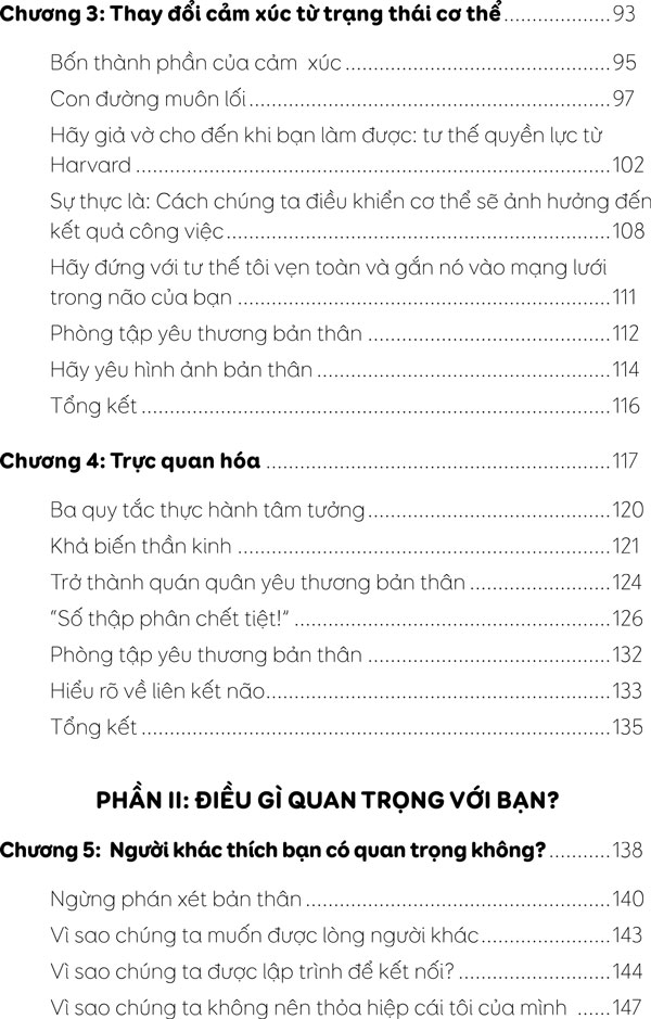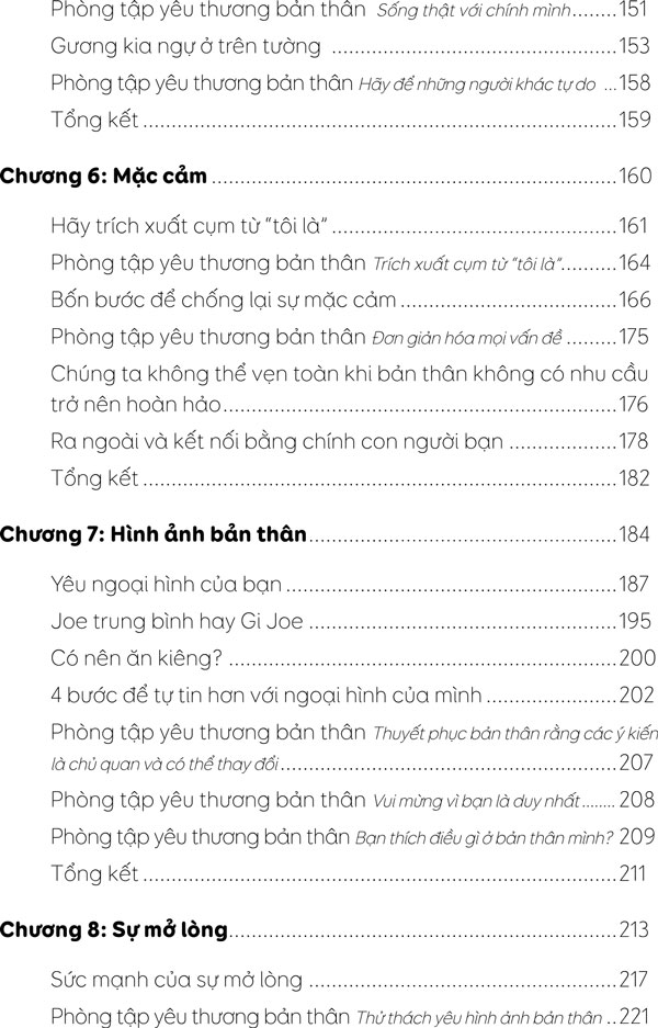 Trong cuốn sách tác giả sẽ giới thiệu đến chúng ta những giai đoạn yêu thương bản thân. Bạn sẽ thấy tính tự ti đã len lỏi vào cuộc sống của bạn như thế nào dù khi được sinh ra bạn không hề mang theo nó. Trong khoảng những năm đầu đời bạn sẽ học được nó, rồi dần sẽ trở thành chính con người bạn khi đã gắn cứng vào mạch não mình.