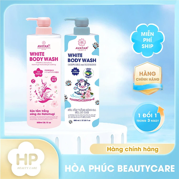 Combo 2 Chai Sữa Tắm Trắng Sáng Da Avatar White Body Wash (1 Chai Sữa Bò Tươi 800mL và 1 Chai Hạt Ý Dĩ 800mL )