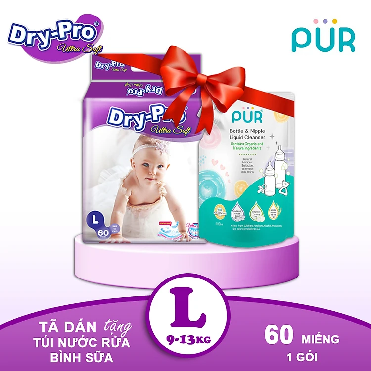 Combo tã/bỉm dán Dry-Pro L60 (9kg-13kg) + tặng Túi nước rửa bình sữa Pur 450ml