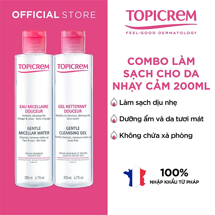 Combo Tẩy trang Topicrem Gentle Micellar Water 200ml và Rửa mặt Topicrem Gentle Cleansing Gel 200ml giúp làm sạch da nhẹ nhàng