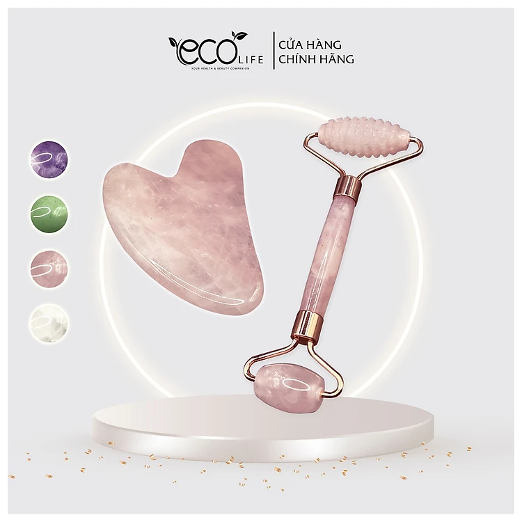 Combo thanh lăn massage và Guasha chất liệu đá thạch anh hồng lá tự nhiên
