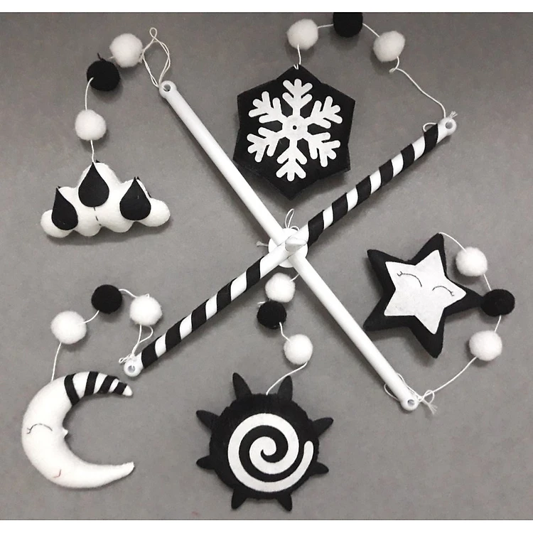 Đồ chơi treo nôi cũi kích thích thị giác đen trắng được làm handmade khâu tỉ mẩn bằng tay, chất liệu vải nỉ.