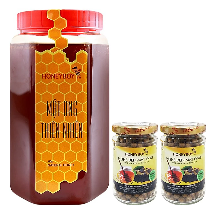 Combo Thực Phẩm Chức Năng Honeyboy: Mật Ong Thiên Nhiên 1Kg + 2 Nghệ Đen Mật Ong 80g - Mật ong là sản phẩm kết tinh từ một quá trình làm việc chăm chỉ và cần mẫn của hàng ngàn chú ong thợ. Nghệ đen mật ong là bài thuốc bổ dưỡng để cải thiện tình hình sức khỏe, đặc biệt là đối với sức khỏe của phái đẹp.