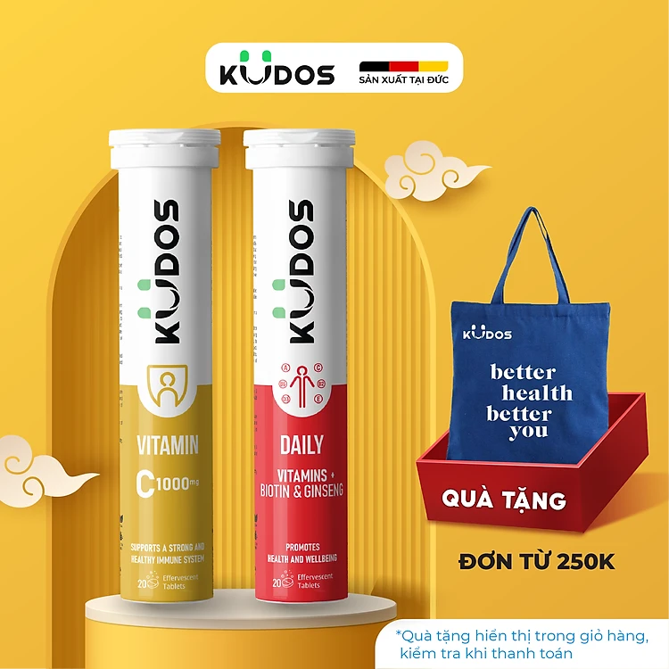 Combo Thực phẩm bảo vệ sức khỏe KUDOS DAILY VITAMINS PLUS BIOTIN & GINSENG + KUDOS VITAMIN C 1000MG (20 viên/tuýp)