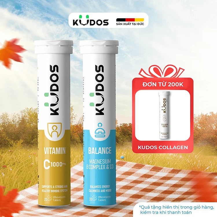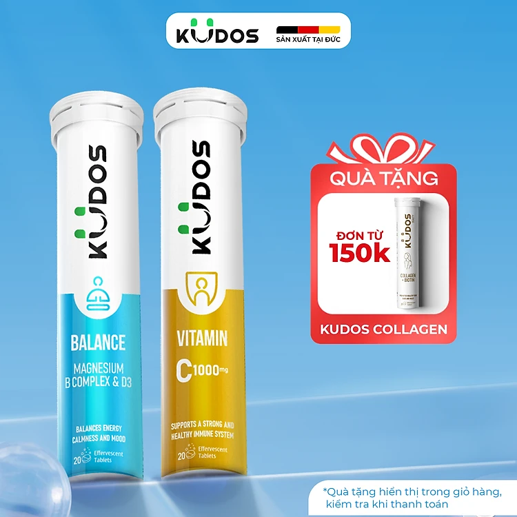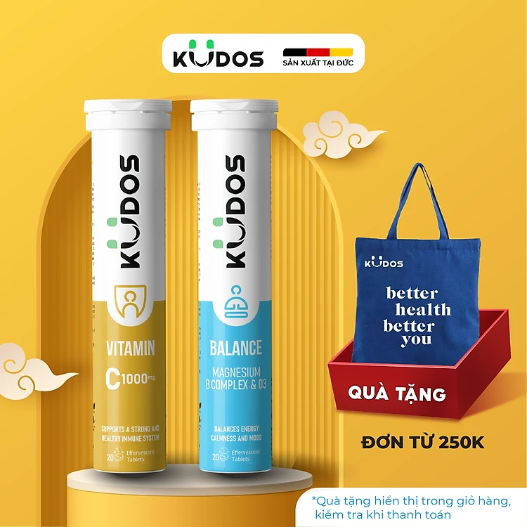Combo Thực phẩm bảo vệ sức khỏe KUDOS BALANCE MAGNESIUM WITH B VITAMIN COMPLEX & D3 + KUDOS VITAMIN C 1000 MG (20v/tuýp)