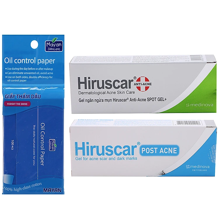 Combo Ngừa Mụn Gồm Kem Chấm Mụn Hiruscar Spot Gel 10g Và Gel Ngừa Mụn Thâm Sẹo Hiruscar Post Acne 10g Kèm Túi Mỹ Phẩm Và Giấy Thấm Dầu