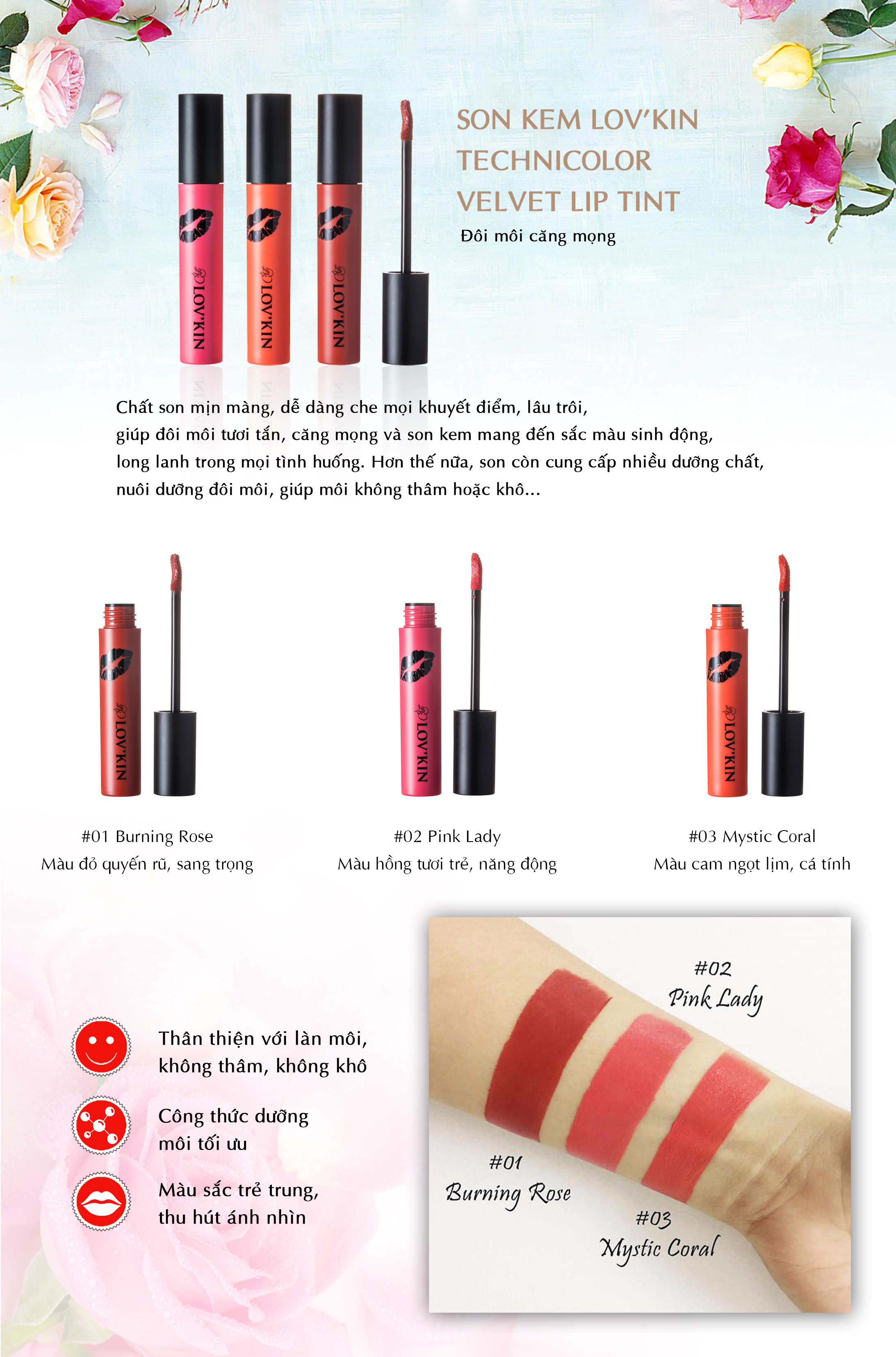 Với ưu điểm vượt trội về độ lâu trôi và lên chuẩn màu, son kem lì được hầu hết các tín đồ thời trang ưa chuộng. Son kem lì LOV’KIN Technicolor Velvet Lip Tint bền màu suốt 6-8 tiếng, tha hồ ăn uống mà không lo trôi mất màu son.