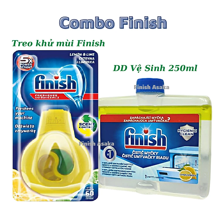 Combo Vệ sinh máy rửa bát Finish: Dung dịch vệ sinh chai 250ml, Viên Treo khử mùi hôi trong máy rửa bát - Chính Hãng.