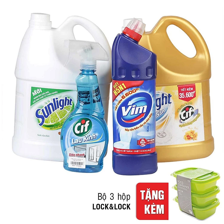 Combo Vệ Sinh Nước Lau Sàn Sunlight Chai (3.8kg) + Nước Rửa Chén Sunlight Chai (3.8kg) + Nước Tẩy Bồn Cầu Vim Diệt Khuẩn (900ml) + Cif Lau Kính (520ml)