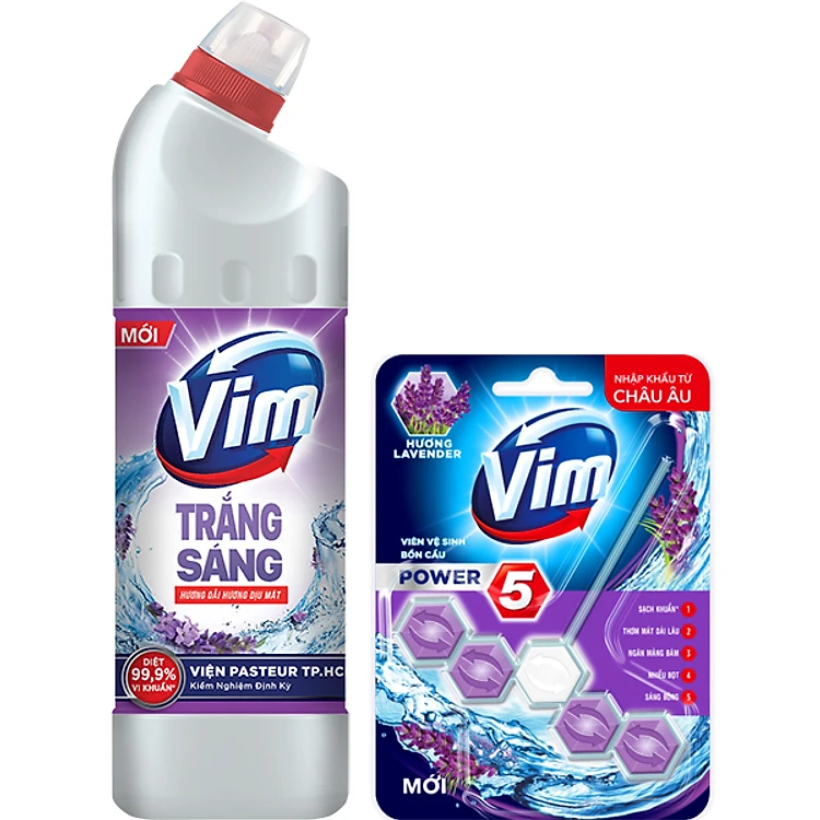 • Combo Vim Trắng Sáng Hương Oải Hương Dịu Mát 880ml và Viên Treo Vệ Sinh Bồn Cầu Vim Power 5 55g dịu mát giúp tẩy rửa bồn cầu và nhà tắm, diệt sạch vi khuẩn gây bệnh, cho bồn cầu và phòng tắm trắng sáng và lưu lại hương thơm dịu mát, sạch sẽ.