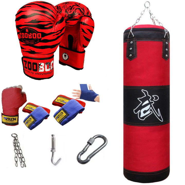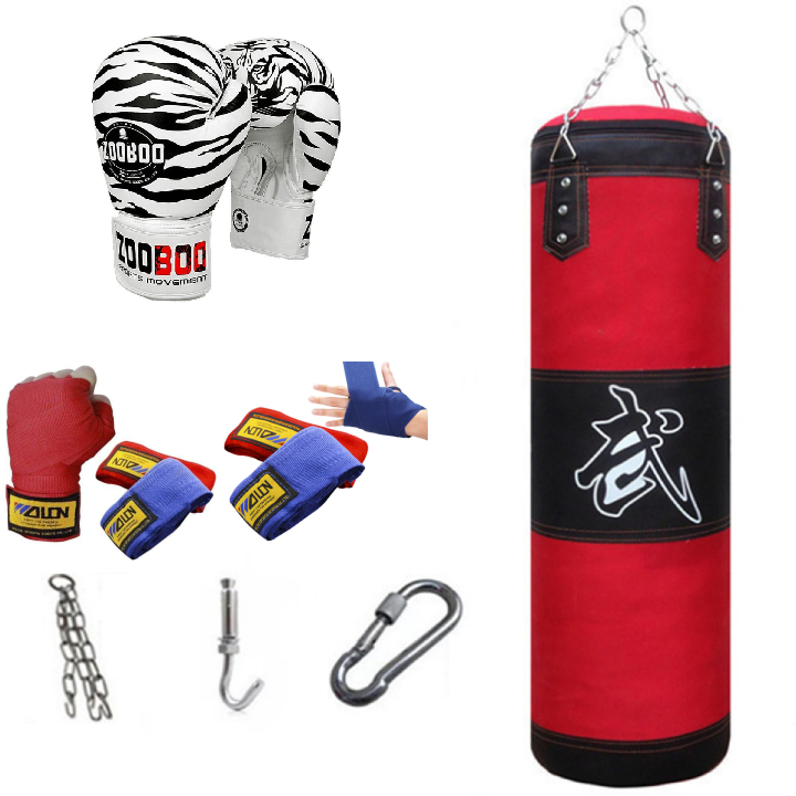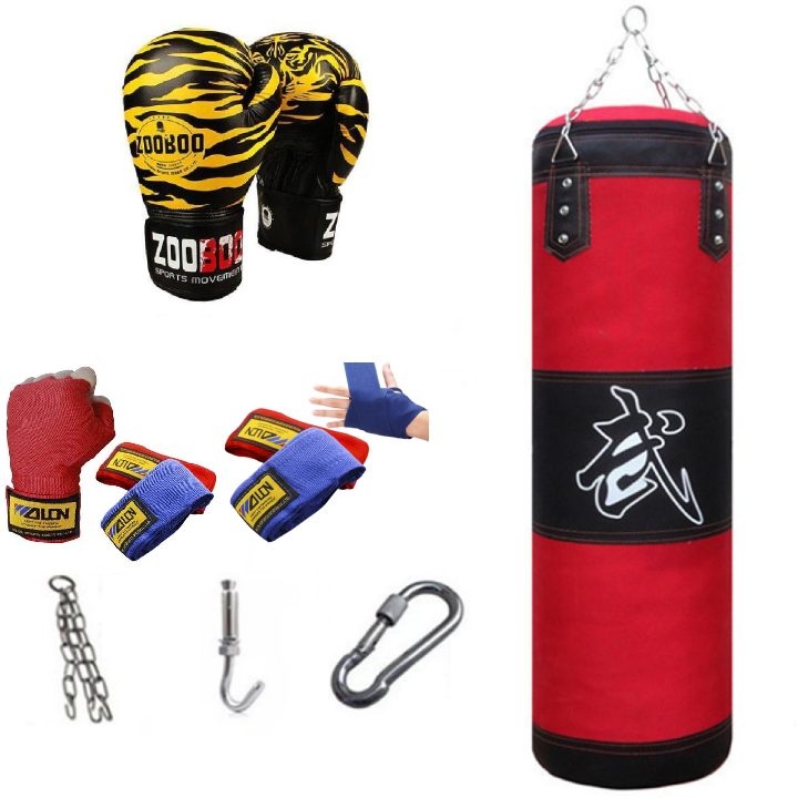Combo vỏ bao cát đấm bốc boxing 4 lớp dài 105cm, Ø=35cm + Găng tay đấm bốc boxing hổ vằn + Băng đa cuốn tay - Tặng thêm 7 món bao gồm dây xích + móc treo + vít nở sắt + lót tay chân