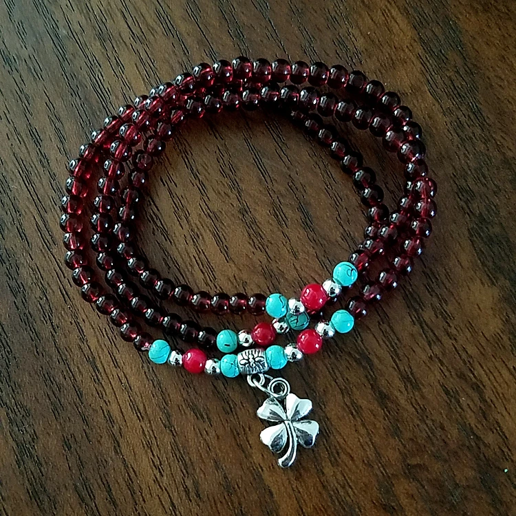 Combo Vòng đeo tay phong thủy Cỏ 4 lá chất liệu đá Ngọc Hồng Lựu, kèm hộp đựng lót Nỉ