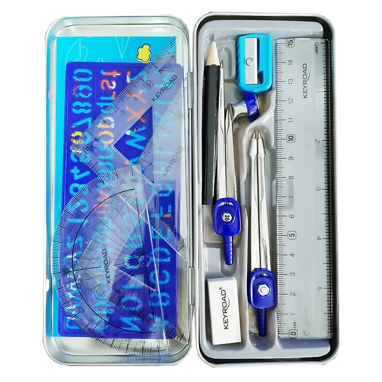 Combo 11 món gồm: Compa gắn viết, compa làm dấu, viết chì, chuốt, gôm, thước đo độ, thước êke 45 độ, thước êke 60 độ, thước 15cm, thời khóa biểu, thanh nhựa khuôn chữ - số,
