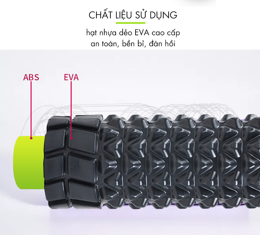 Bề mặt con lăn bố trí các hạt massage nổi hình tam giác, có độ đàn hồi vừa phải khi tiếp xúc với da người dùng