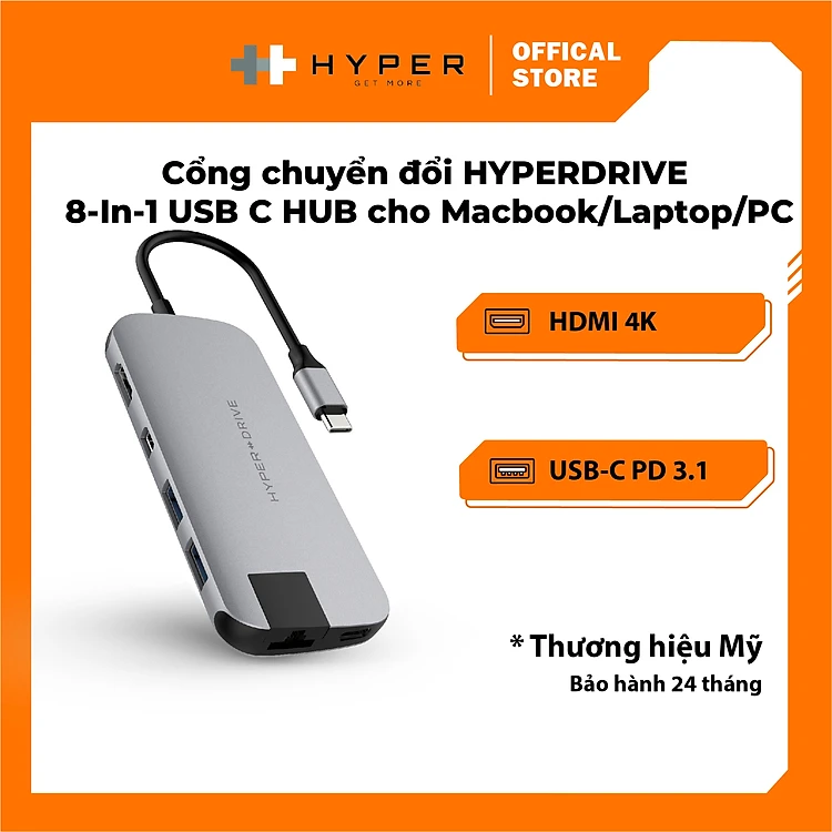 CỔNG CHUYỂN HYPERDRIVE SLIM 8 IN 1 USB-C HUB FOR MACBOOK, SURFACE, PC & DEVICES – HD247B - HÀNG CHÍNH HÃNG