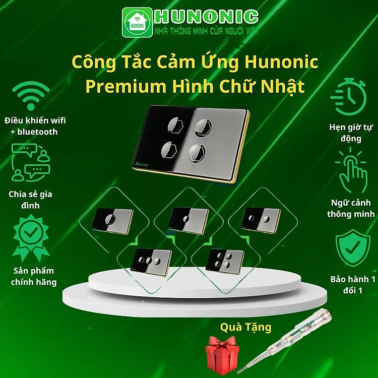 Công Tắc Cảm Ứng Hunonic Premium Hình Chữ Nhật Viền Vàng, Công Tắc Thông Minh Wifi Điều Khiển Từ Xa Bằng Điện Thoại