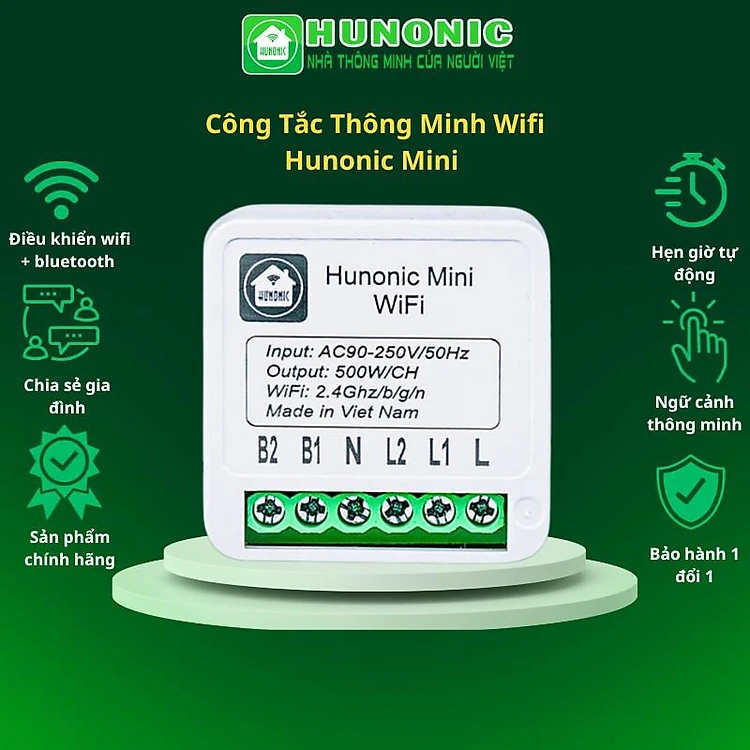 Công Tắc Thông Minh Wifi Hunonic Mini Điều Khiển Từ Xa Qua Điện Thoại, Hẹn Giờ Tự Động, Hàng Việt Nam.