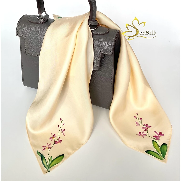 Cột Tóc Nữ Lụa Tơ Tằm Vẽ Tay Hoa Lan SenSilk, Khăn Lụa Đẹp Thời Trang 55x55cm