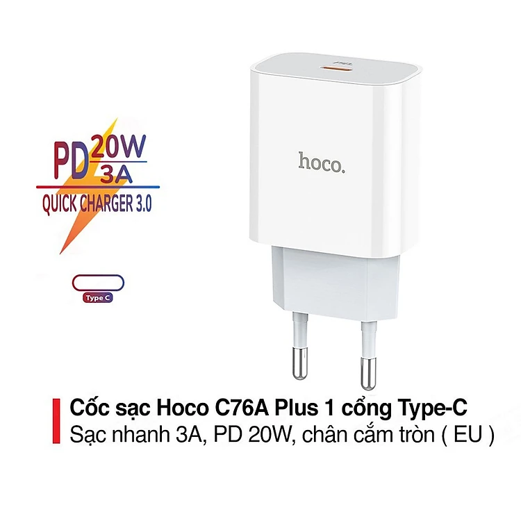 Củ sạc PD20W Hoco C76A PLus chuôi tròn 1 cổng Type-C dành cho mọi thiết bị - Hàng chính hãng