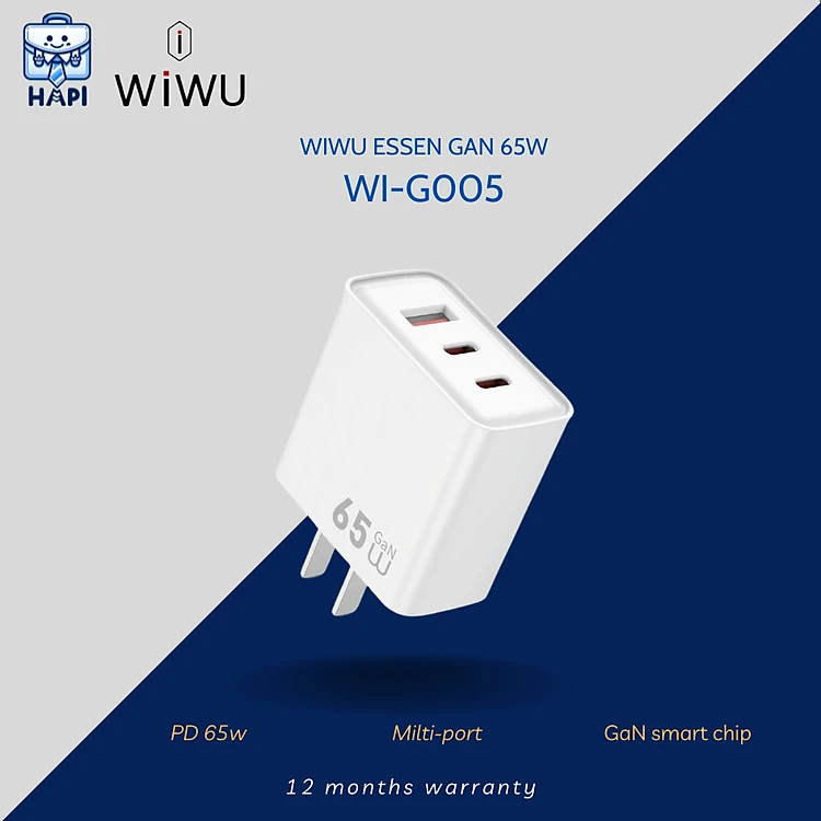 Củ sạc GaN hàng chính hãng WiWU Essen 65W Wi-G005: 2 Type-C, 1 USB-A, chân dẹt US, sạc nhanh đa thiết bị