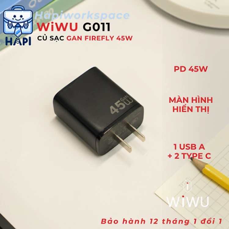 Củ sạc GaN hàng chính hãng WiWU Firefly 45W Wi-G011: 3 cổng, hỗ trợ PPS 21V, QC3+, sạc nhanh đa thiết bị