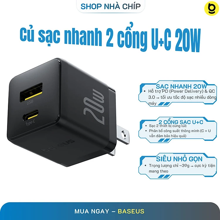 Củ Sạc Nhanh Baseus Palm 20W 2 Cổng C+U PD QC3.0 Dùng Cho iPhone Samsung Pixel Nhỏ Gọn Tiện Lợi - Hàng Chính Hãng